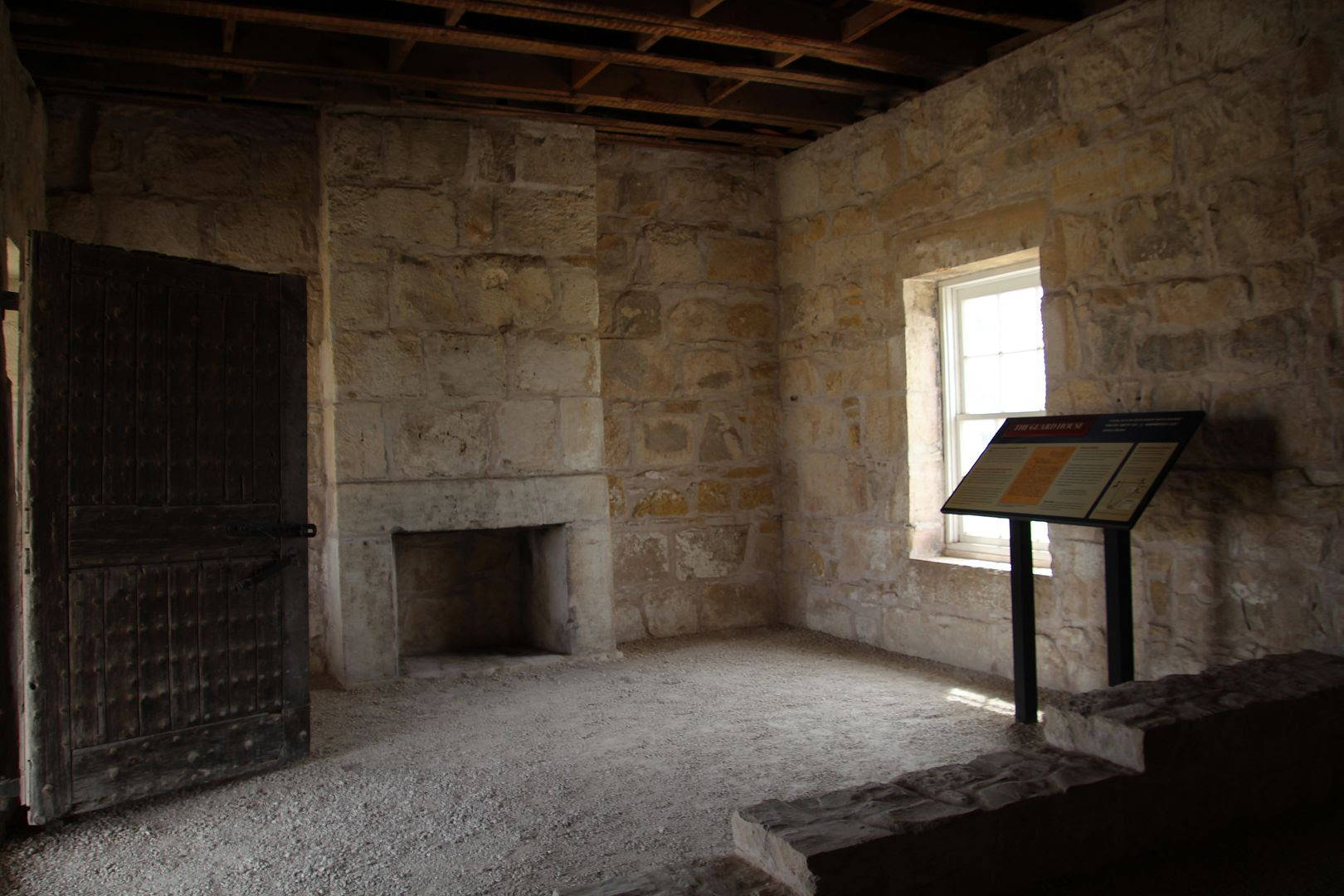 There are two sections in the Guardhouse: one for guards and the second one for prisoners. It was designed to hold 2 cellmates, but was usually occupied by 15. There was no heat, poor ventilation, and little light, making for a very uncomfortable stay (and considered part of the punishment). Also, a small room next next to the larger cell was used for solitary confinement.